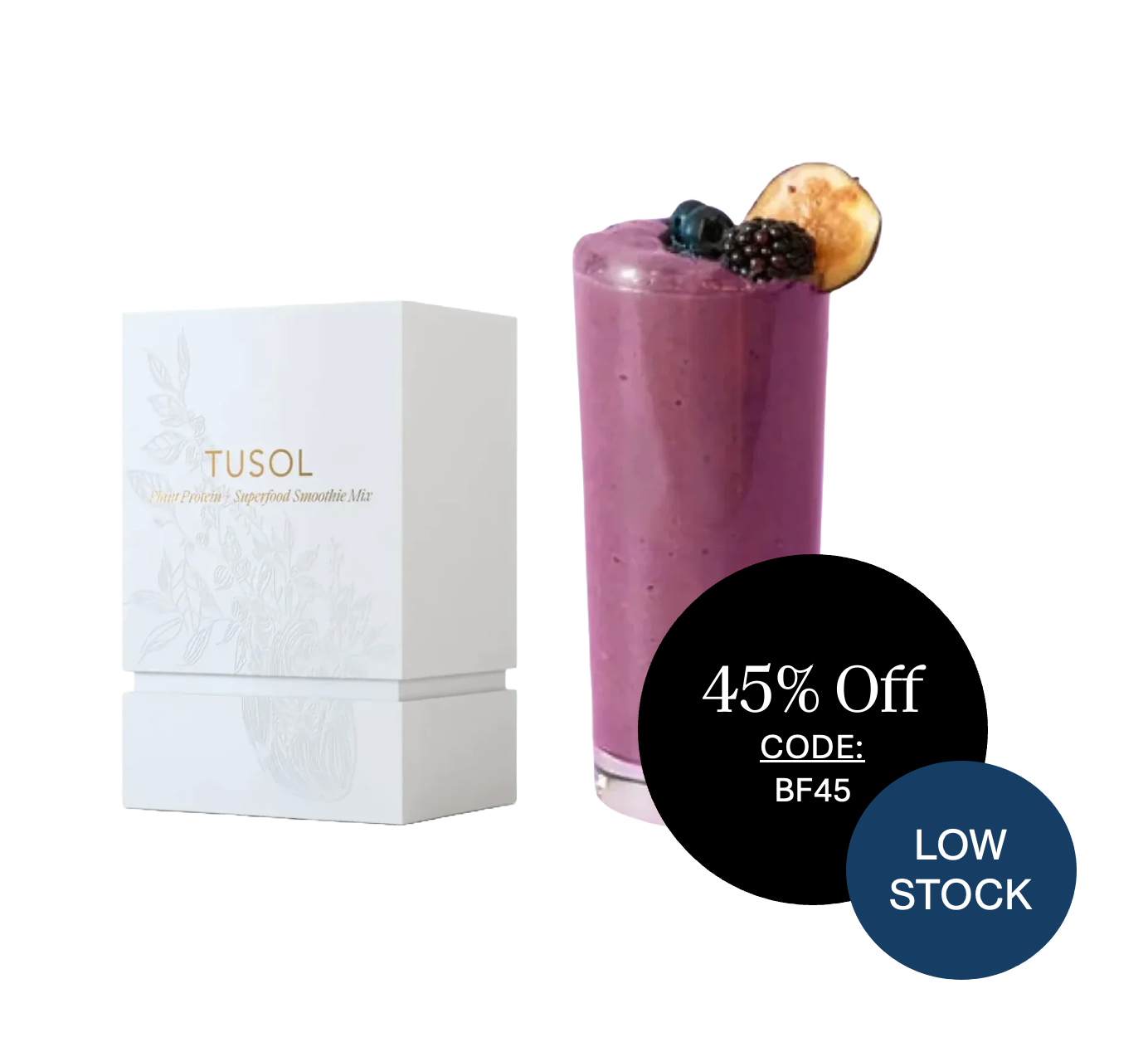 TUSOL smoothies are filled with 16g plant protein, 29+ superfoods, 16+ adaptogens, probiotics and enzymes for a complete meal in under 60 seconds.